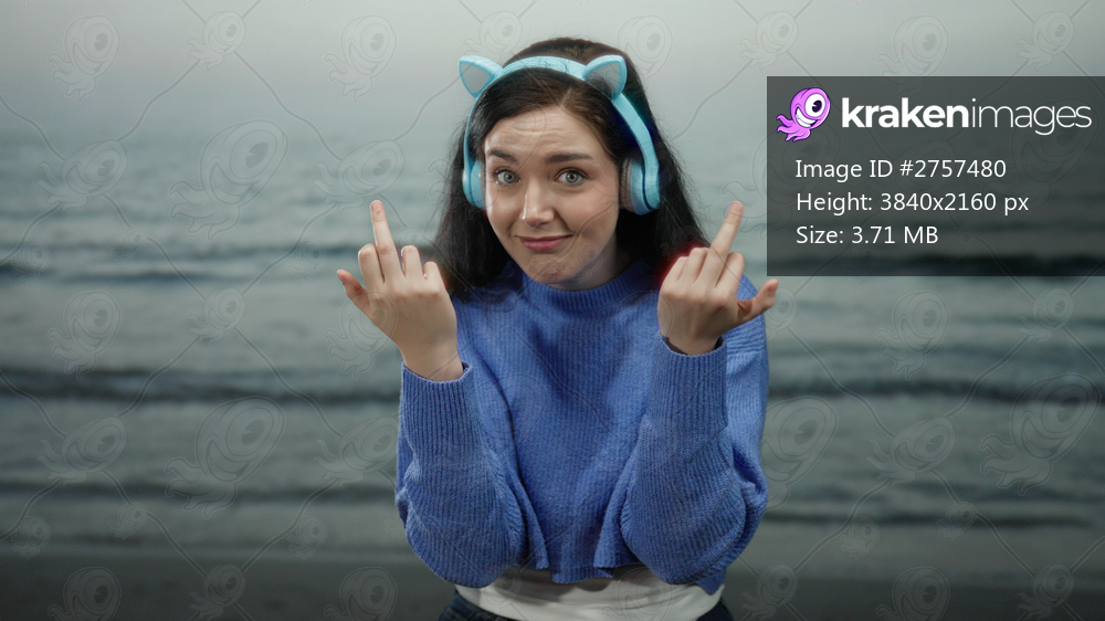 Woman wearing headphones and smiling while gesturing at the beach with the ocean in the background on a cloudy day, capturing a playful and carefree moment. - Kraken Images