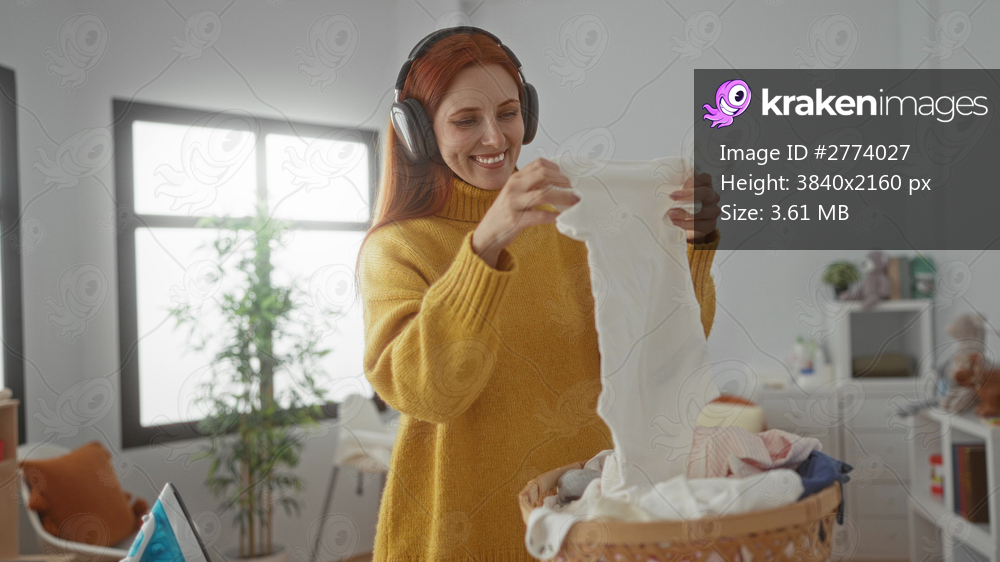 Woman wearing headphones sorting laundry in a cozy home room featuring a plant and a basket of clothes while dressed in a yellow sweater.