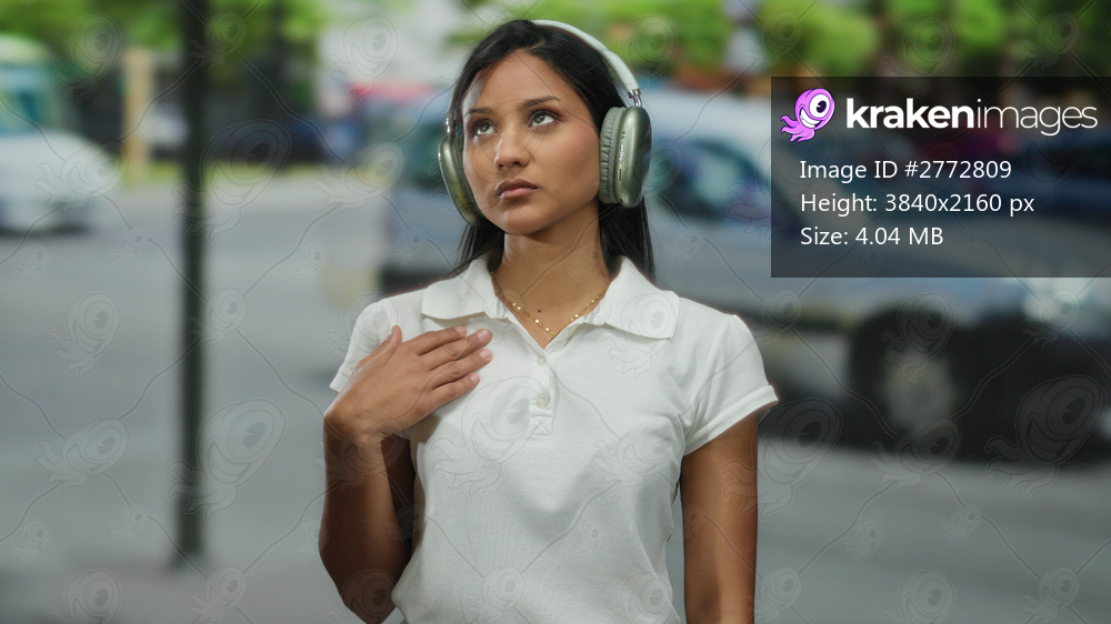 Woman wearing headphones stands on a busy street with cars passing by, absorbed in thought, youthful energy and focus apparent in her demeanor.