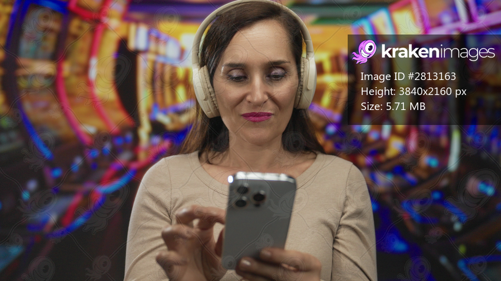 Woman wearing headphones uses smartphone in vibrant casino setting with slot machines in background, showcasing a modern leisure activity indoors.