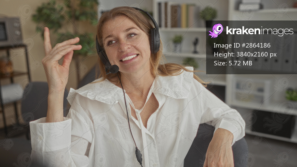 Woman wearing headset smiling and gesturing with hand in office building; friendly conversation connection contentment.