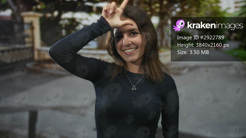 Woman wearing heart pendant necklace, hand forming l on forehead while smiling on street near trees and fence; playful.