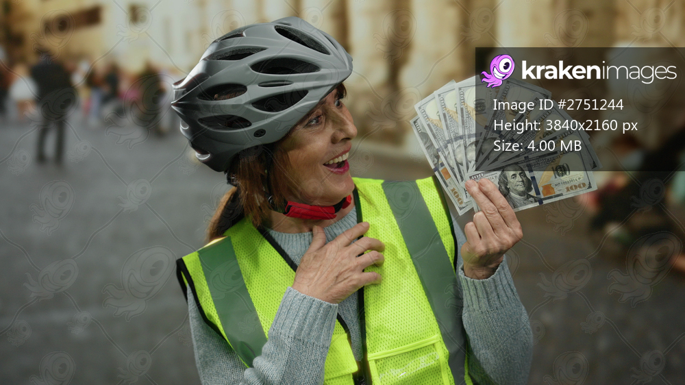 Woman wearing helmet holds american dollars excitedly on a city street, showcasing money in an urban outdoor setting with a lively atmosphere.