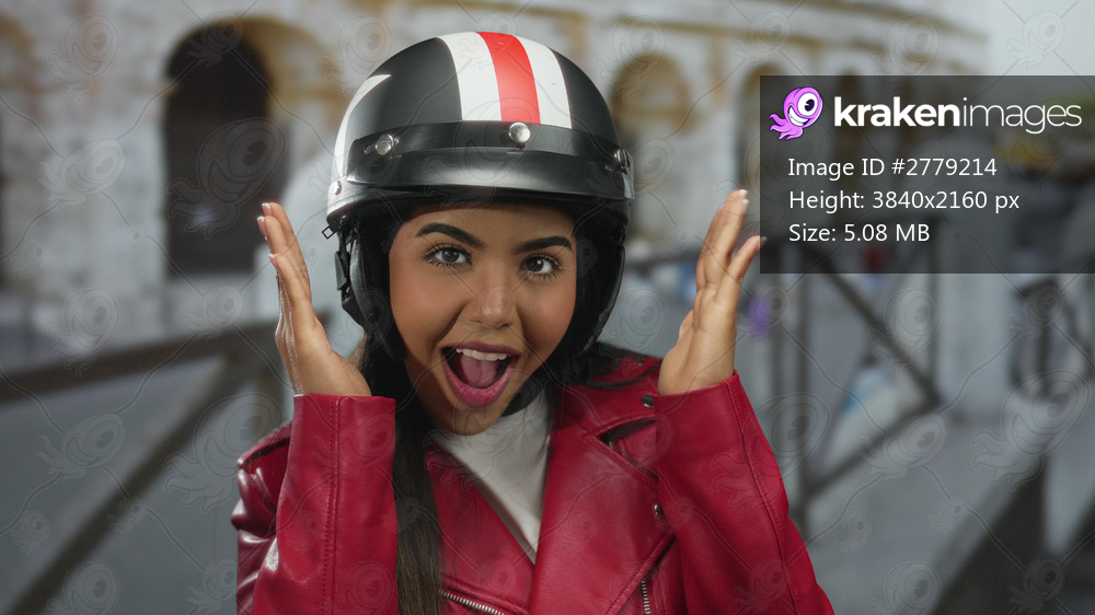 Woman wearing helmet performs peekaboo at coliseum while young latin hispanic bike enthusiast on motorbike enjoys roman backdrop.