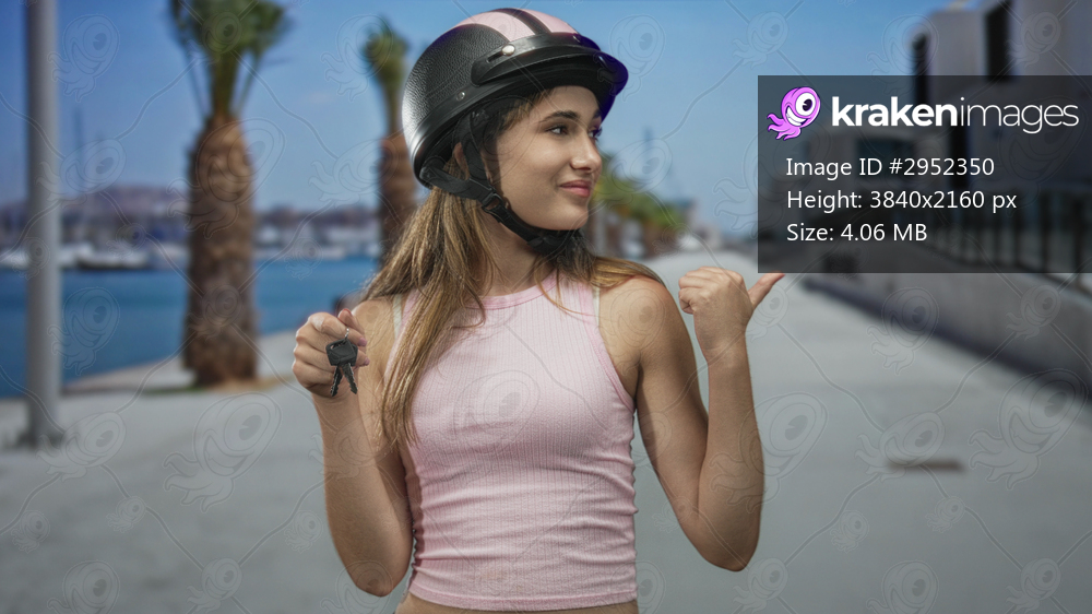 Woman wearing helmet and pink tank holding car keys points thumb to street by palm trees and seaside building; confidence travel freedom.