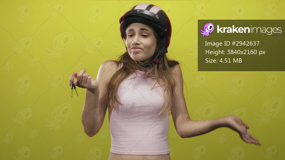 Woman wearing helmet shrugs shoulders holding keys in hand in studio with yellow wall; uncertainty dilemma.