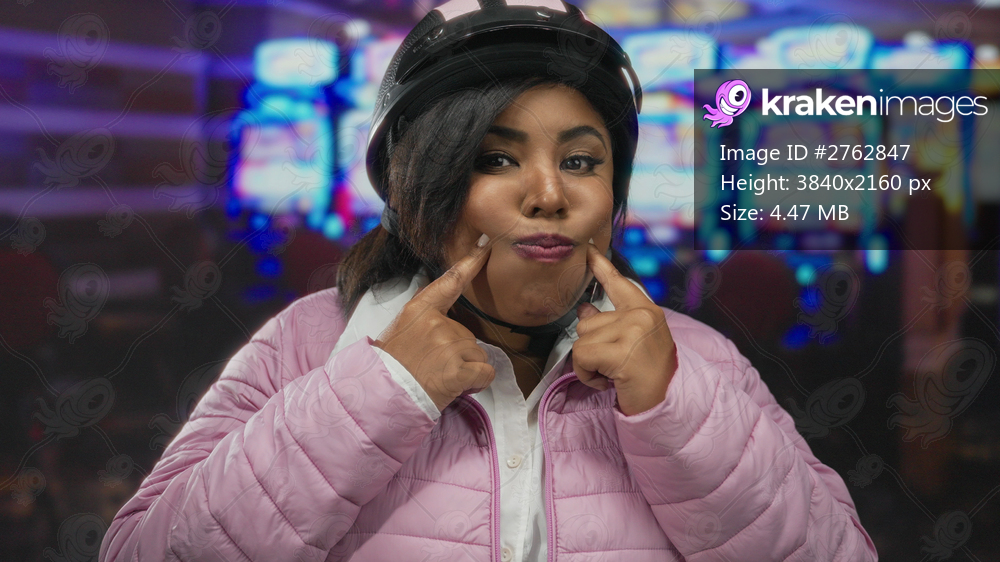 Woman wearing helmet smiles and points at cheeks in a casino with colorful slot machines in the background