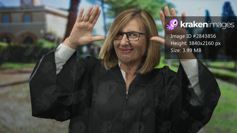 Woman wearing judge robe holds both hands raised on green lawn in front of building, smiling; pride empowerment.