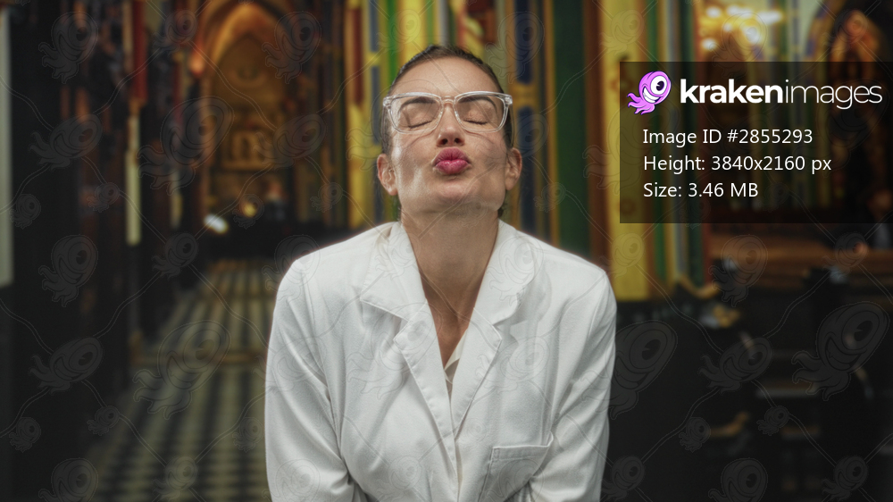 Woman wearing lab coat and safety glasses touches chin with folded hands inside church building; curiosity joy faith.