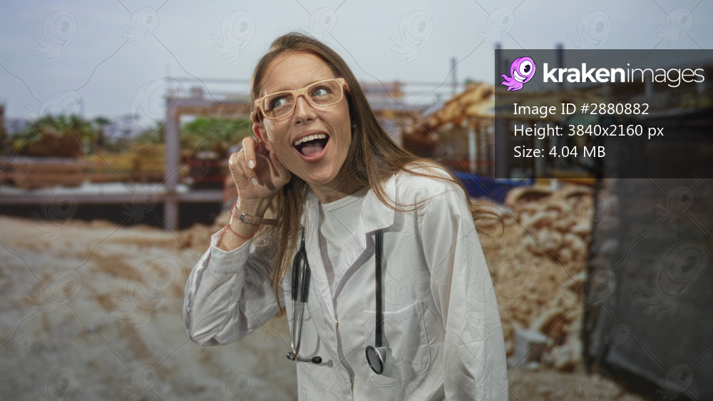 Woman wearing lab coat and stethoscope holding hand to ear at building construction site, looking attentive and listening; curiosity care.