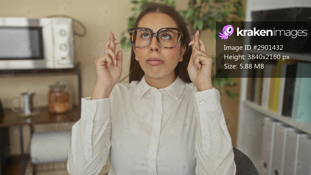 Woman wearing large glasses and white shirt crossing fingers at desk near shelf microwave and binders in office building; hopeful.