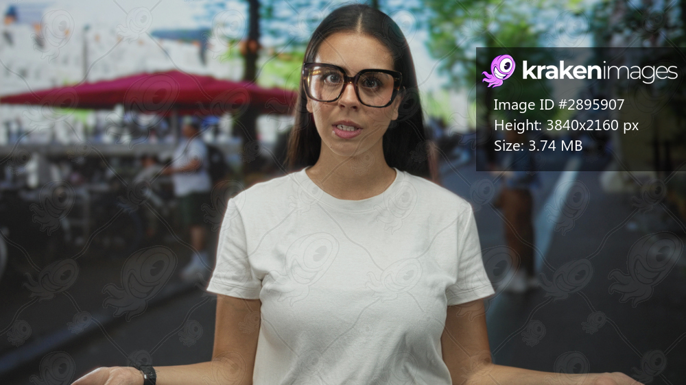 Woman wearing large glasses and white t shirt points finger toward camera on busy street market with red umbrella; playful confidence.