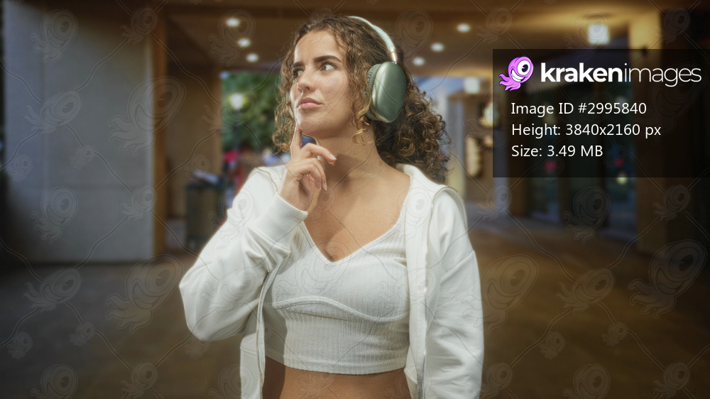 Woman wearing large headphones touches chin with finger while listening in a building corridor, white crop top and hoodie visible; contemplation.