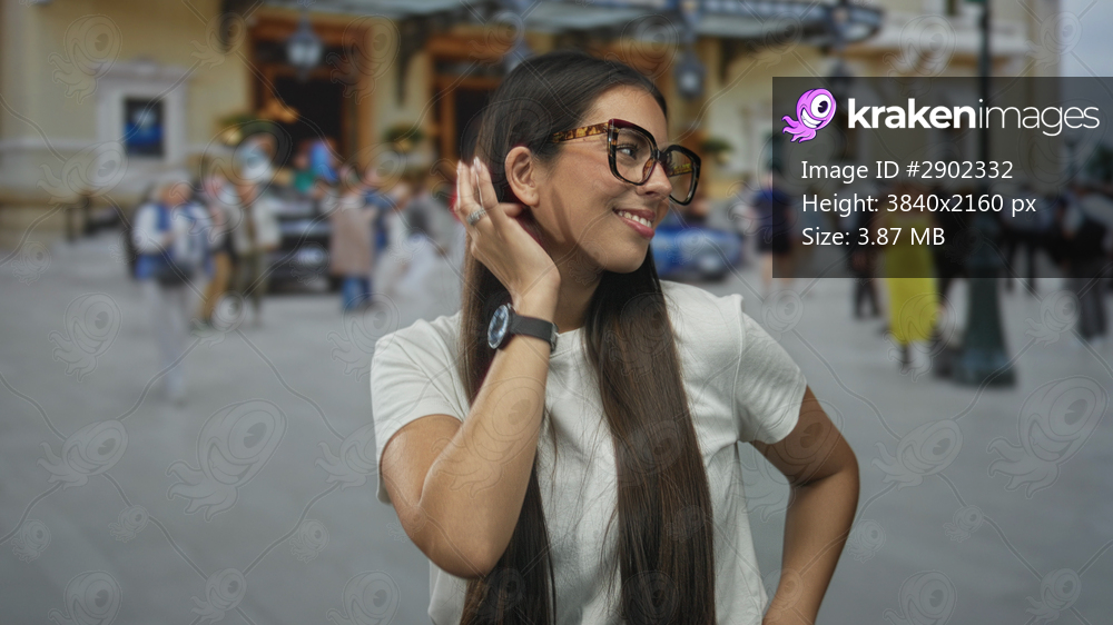 Woman wearing large tortoiseshell glasses and white t shirt smiling while touching long brunette hair on a busy city street amid a blurred crowd; city moment joy. - Kraken Images