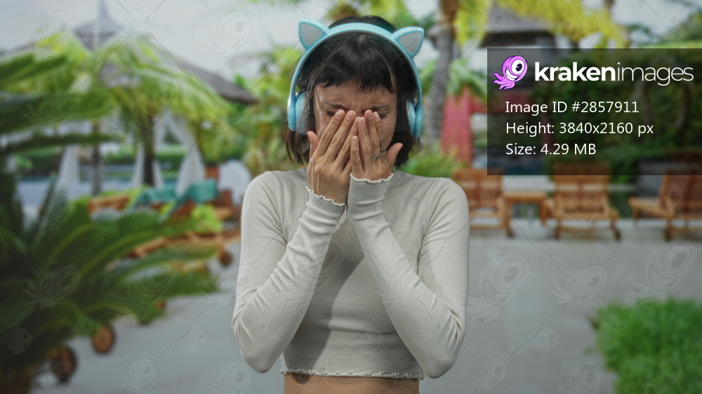 Woman wearing light blue cat ear headphones covering her face with both hands at building; frustration.