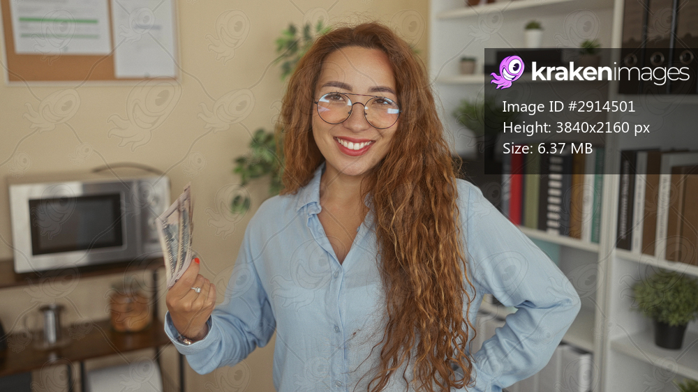 Woman wearing light blue shirt and glasses holding fanned cash, hand visible, smiling in office building; financial confidence.