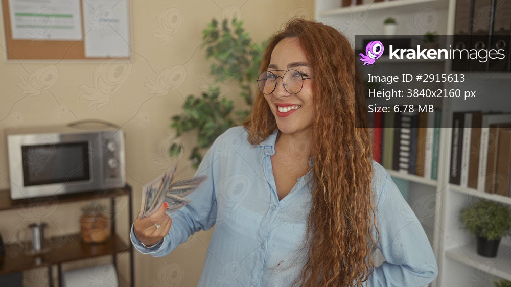 Woman wearing light blue shirt and glasses holding fanned cash, hand visible, smiling in office building; financial confidence.