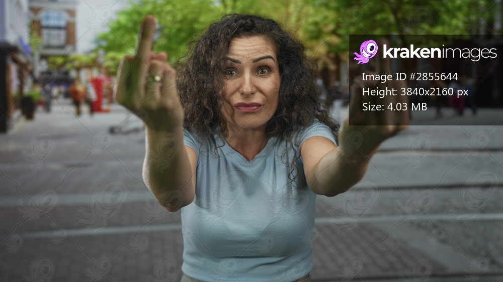 Woman wearing light blue shirt standing shows dual middle finger gesture in crowded city street scene; anger defiance.