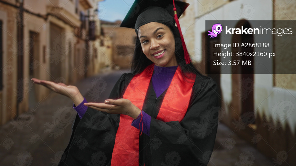 Woman wearing mortarboard presenting open palms on a cobbled old town street; achievement success pride.