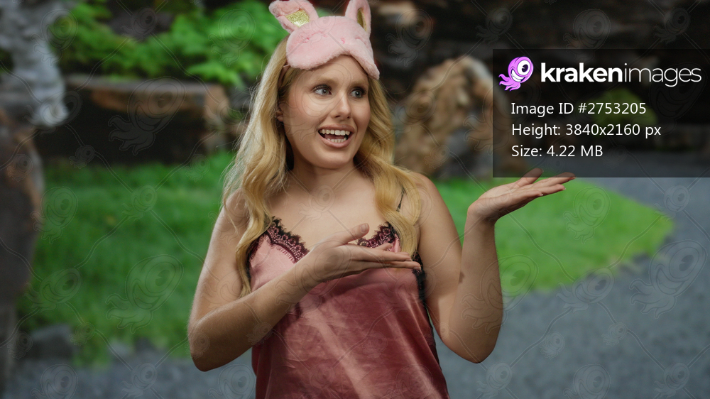 Woman wearing nightwear with pink ears talking in a park surrounded by lush green trees, conveying a playful expression with blonde hair.