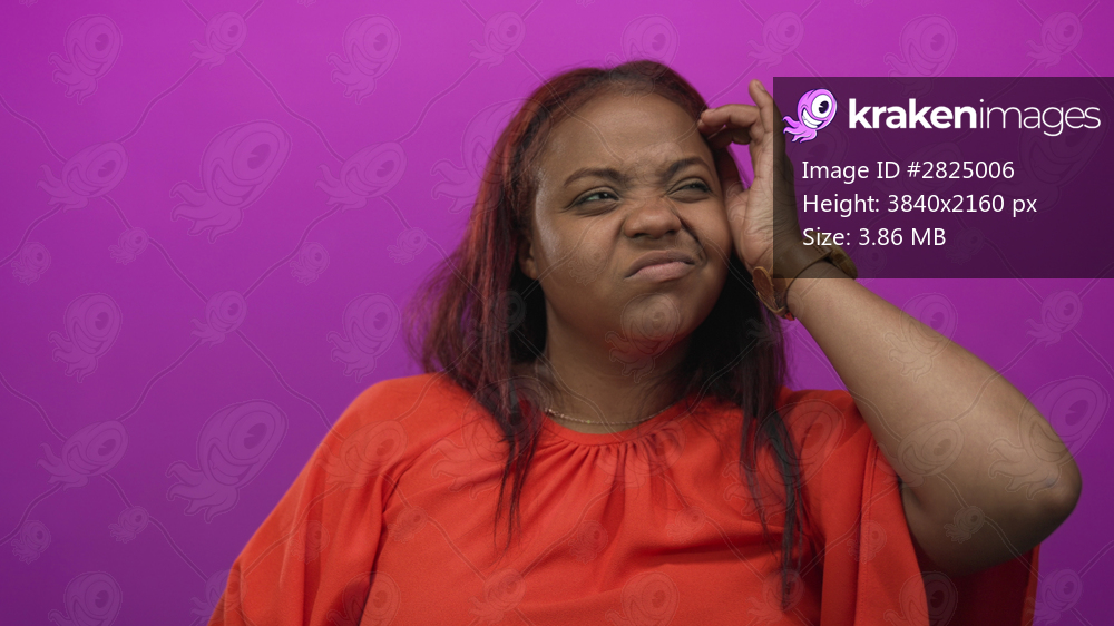 Woman wearing orange blouse touching temple with watch on wrist in purple studio setting; confusion.