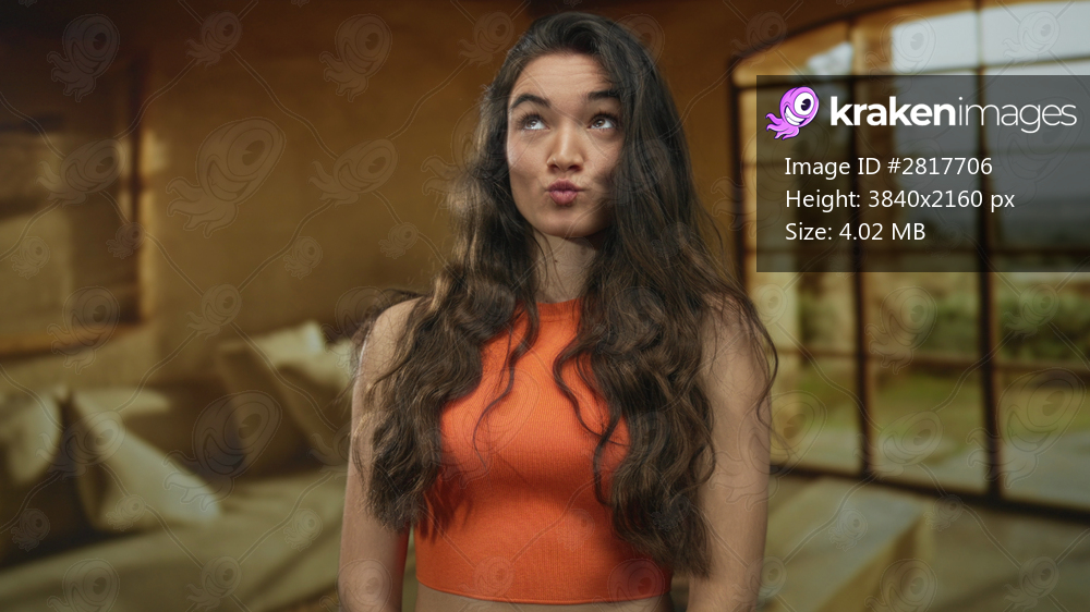 Woman wearing orange crop top with long wavy hair standing and pursing lips while laughing in sunlit living room; playful joy.
