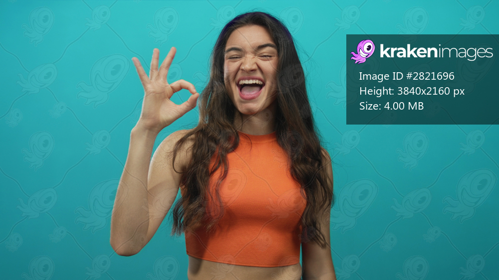 Woman wearing orange crop top showing ok sign with hand in teal studio while smiling broadly; optimism.