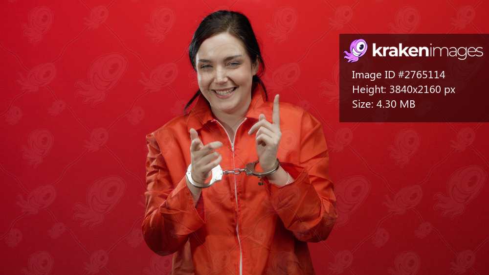 Woman wearing orange jumpsuit and handcuffs against a red background, expressing various emotions, showcasing a concept of incarceration and justice.