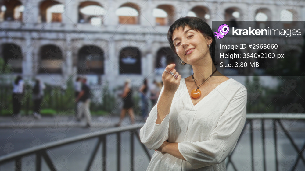 Woman wearing orange pendant necklace beckons with finger in front of historic building; wanderlust confidence.