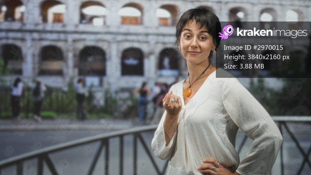 Woman wearing orange pendant necklace beckons with finger in front of historic building; wanderlust confidence.