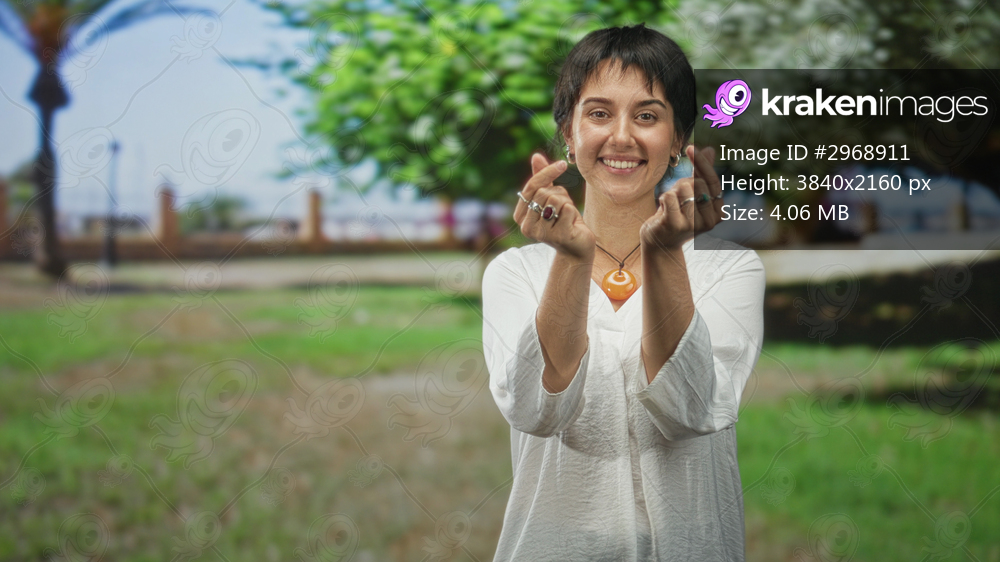 Woman wearing orange pendant necklace making finger heart gesture with both hands on a street promenade; connection joy.