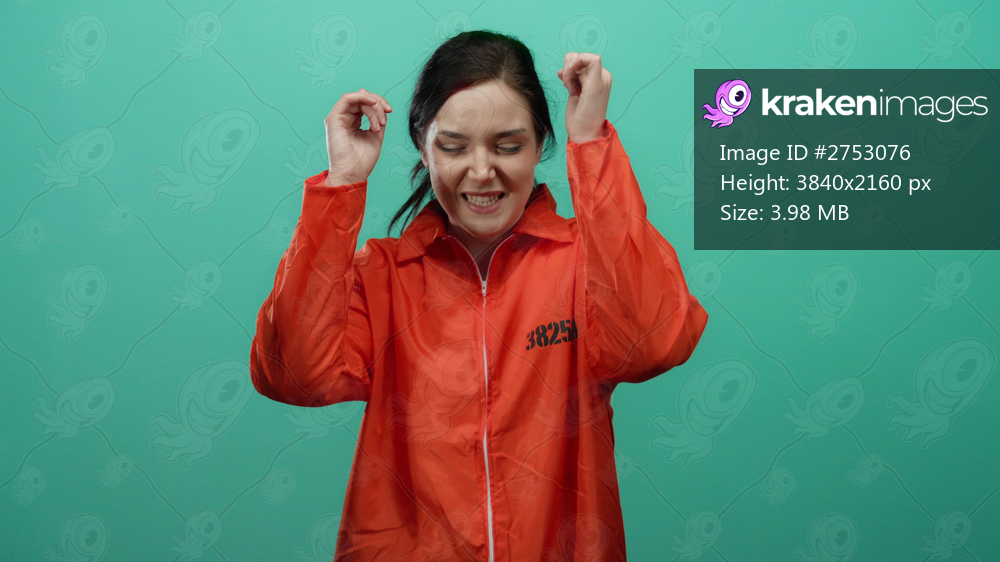 Woman wearing orange prison jumpsuit dances playfully with closed eyes against a vibrant green background, expressing joy and freedom with her brunette hair and relaxed demeanor. - Kraken Images