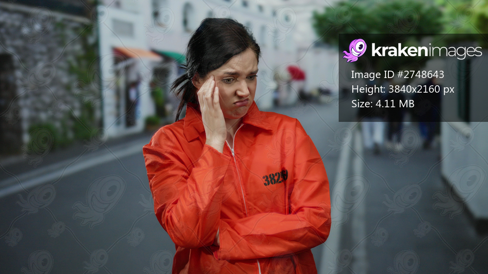 Woman wearing orange prison jumpsuit stands on street appearing frustrated and confused outdoors.