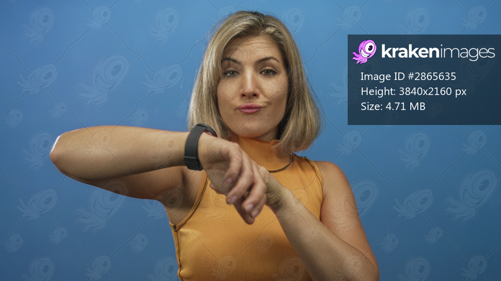 Woman wearing orange sleeveless top pointing finger to watch on bare wrist in blue studio; impatience time pressure urgency.