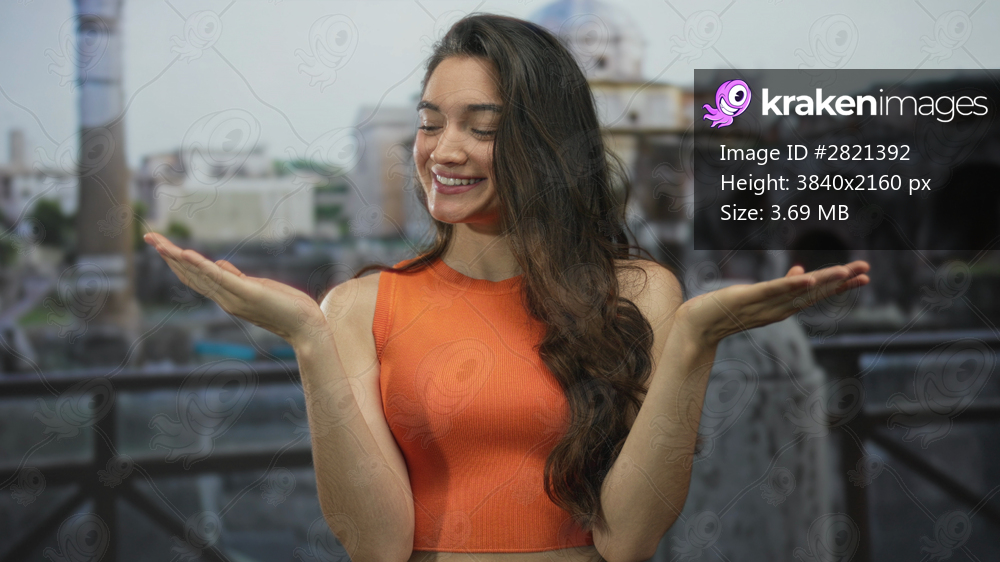 Woman wearing orange top holds open palms and smiles at roman ruins under sunlight; ancient wonder.