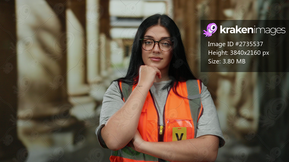 Woman wearing orange vest standing confidently on city street with a thoughtful expression, volunteering outdoors showcasing commitment and community spirit. - Kraken Images