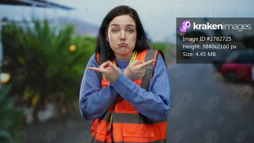 Woman wearing orange vest standing outdoors on street pointing incredulously, brunette volunteer gesturing confusedly against blurred urban backdrop.