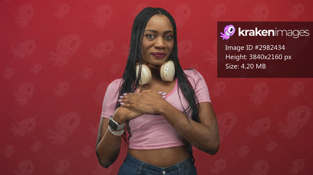 Woman wearing over ear headphones and a pink crop top, hands clasped over chest, standing against a red studio backdrop, relaxed portrait pose; calm gratitude. - Kraken Images
