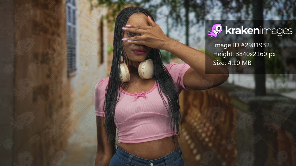 Woman wearing over ear headphones covers eyes with hand on a cobbled street, pink crop shirt and braids visible; playful privacy.