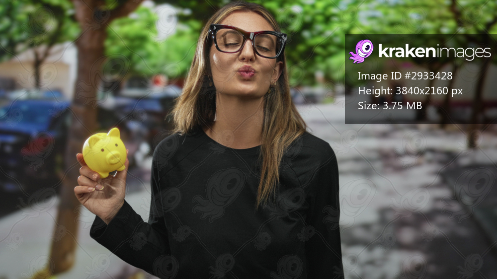 Woman wearing oversized glasses and black shirt holding yellow piggybank in hand on city street smiling at camera; happiness savings.