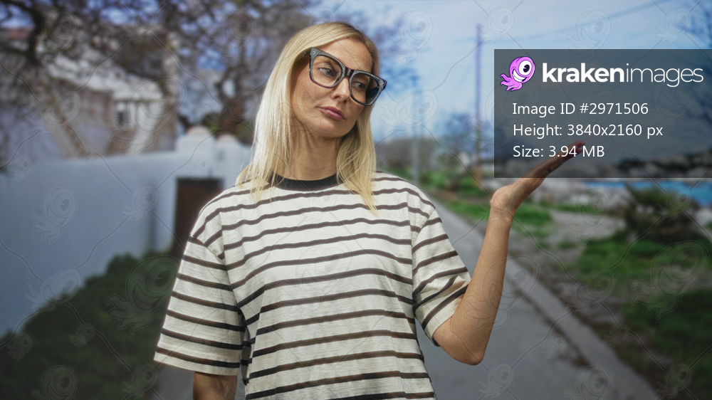 Woman wearing oversized glasses raises her right hand palm up in a casual shrug gesture on a seaside street with houses and path; skepticism.