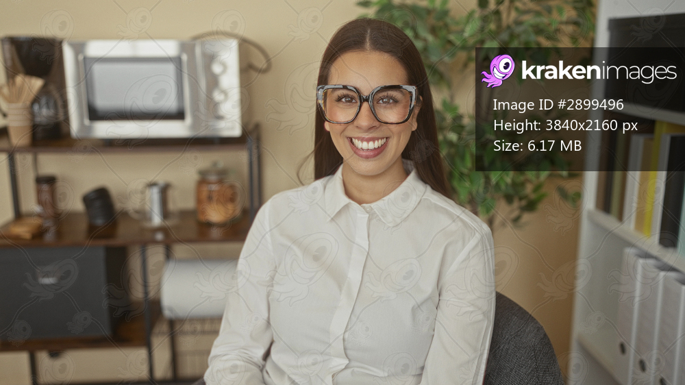 Woman wearing oversized glasses smiling while seated in a building office chair; professional confidence.