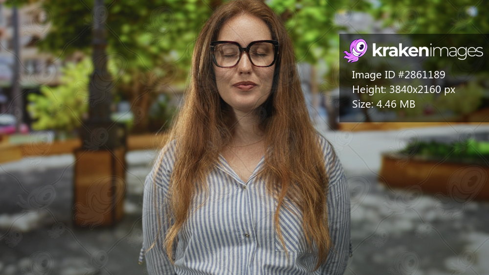 Woman wearing oversized glasses stands smiling at camera on street under soft daylight with a friendly expression; self confidence.