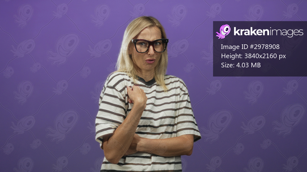 Woman wearing oversized glasses and striped shirt, hand on shoulder with arm crossed and pointing finger, studio; skepticism.