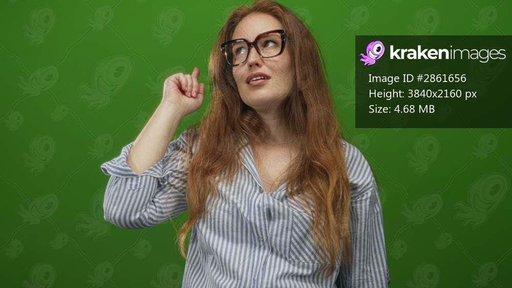 Woman wearing oversized glasses and striped shirt pointing finger upward with gentle smile in a studio; optimism.