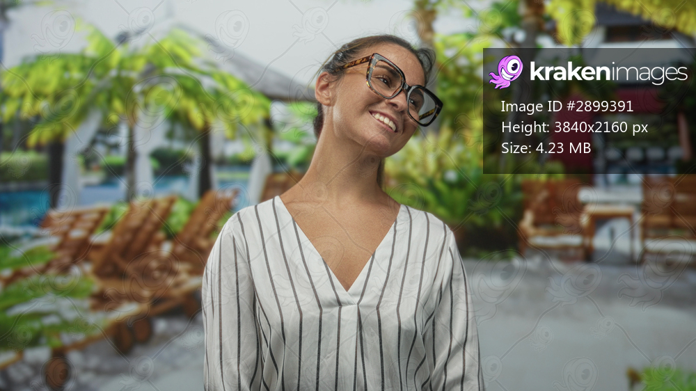Woman wearing oversized glasses tilts head near hotel pool cabanas at resort with a subtle smile and casual posture; contentment.