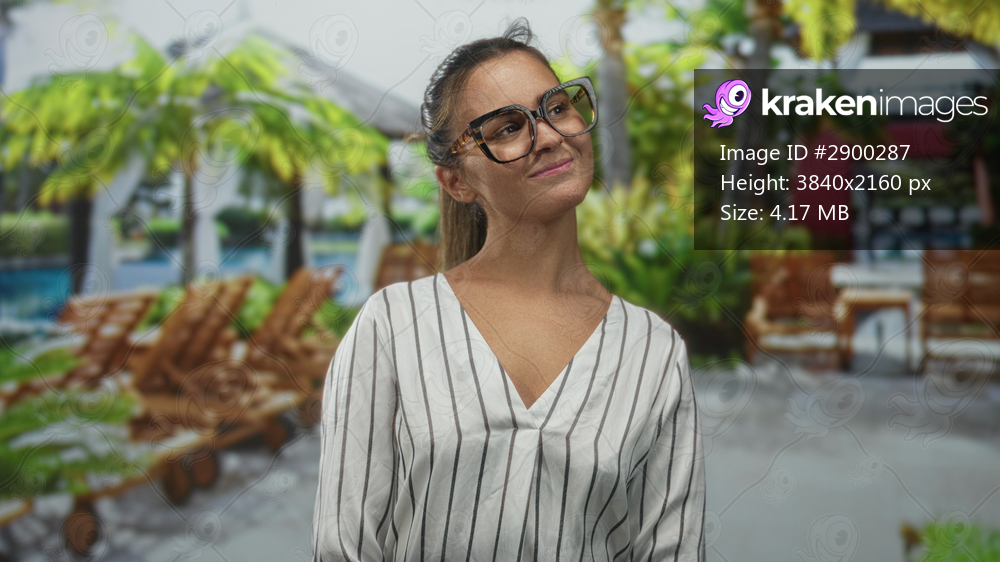 Woman wearing oversized glasses tilts head near hotel pool cabanas at resort with a subtle smile and casual posture; contentment.