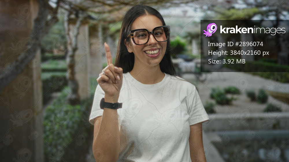 Woman wearing oversized glasses and white t shirt pointing index finger while smiling in a stone building courtyard; confidence friendliness.