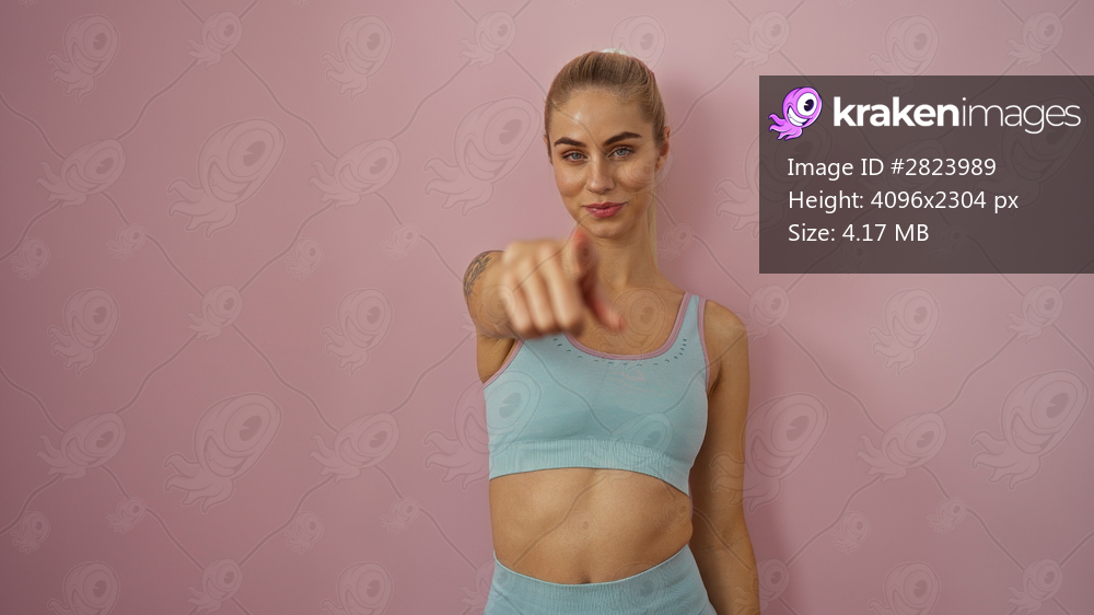 Woman wearing pale blue sports bra stands pointing finger to camera in pink studio; confidence empowerment.