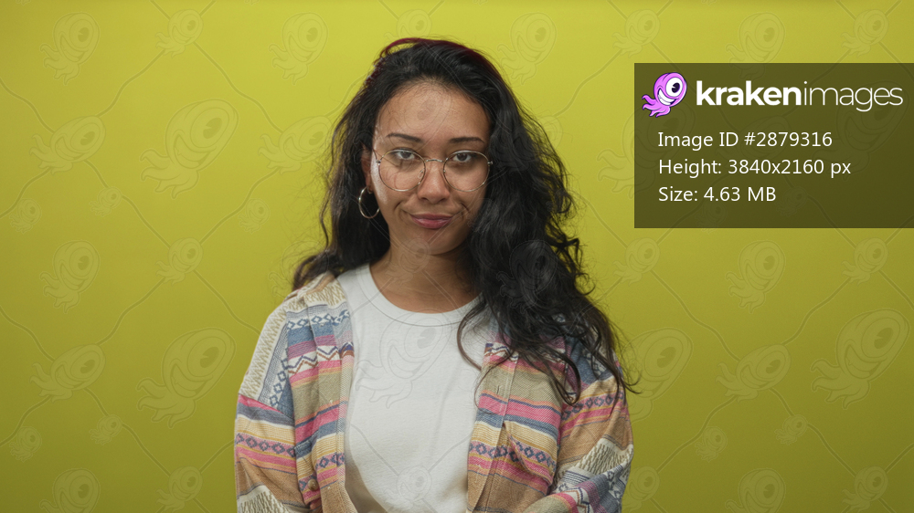 Woman wearing patterned shirt with visible face and closed eyes and pursed lips making a smirk in a lime green studio; skepticism contemplation.
